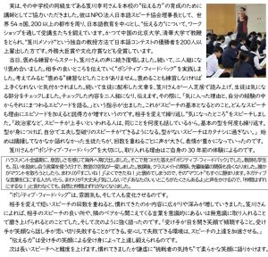 30年前、ハラスメント全盛期に、息苦しさを感じて海外へ飛び出しました。そこで見つけた答えが「ポジティブ・フィードバック」でした。教師も学生も、互いを励まし合う言葉を使うだけで、教室の空気が一変しました。放課後、クラスメイトの関係、先輩後輩の関係も良くなりました。誰かがマウントを取ろうとしたら、まわりが「すごいね!」「よくできたね!」と褒めてしまうので、その“マウント”もすぐに静まります。ネガティブな言葉を口にする人がいたら、まわりが「大丈夫」「気にしないで」「あなたのいいところがたくさんあるよ」と声をかけるので、「仲間はずれにするな!」と言わなくても、自然と仲間はずれがなくなりました。