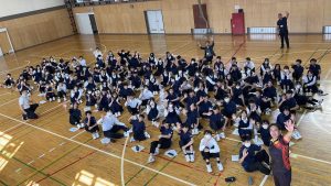 都立中学でワークショップをしました。各学年が体育館に集まって3回行いました。